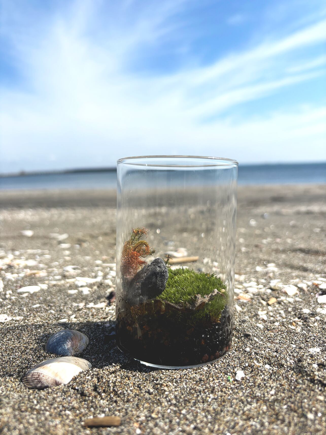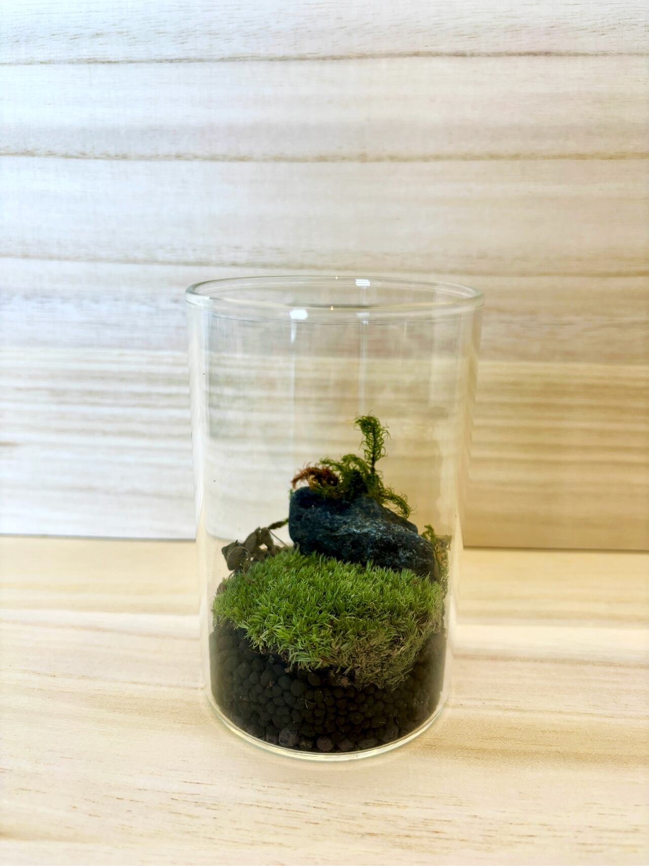 ガラス容器の中に数種類の苔や石を使用し、一点一点手作りで苔の生えている景色を切り取ったような作品に仕上がっています。(アラハシラガゴケ、スギゴケなどを使用)