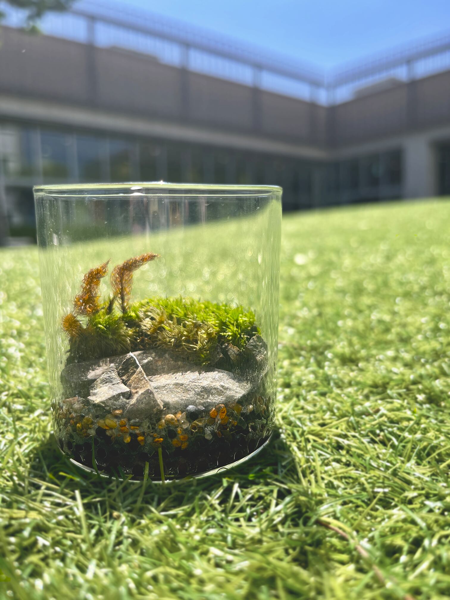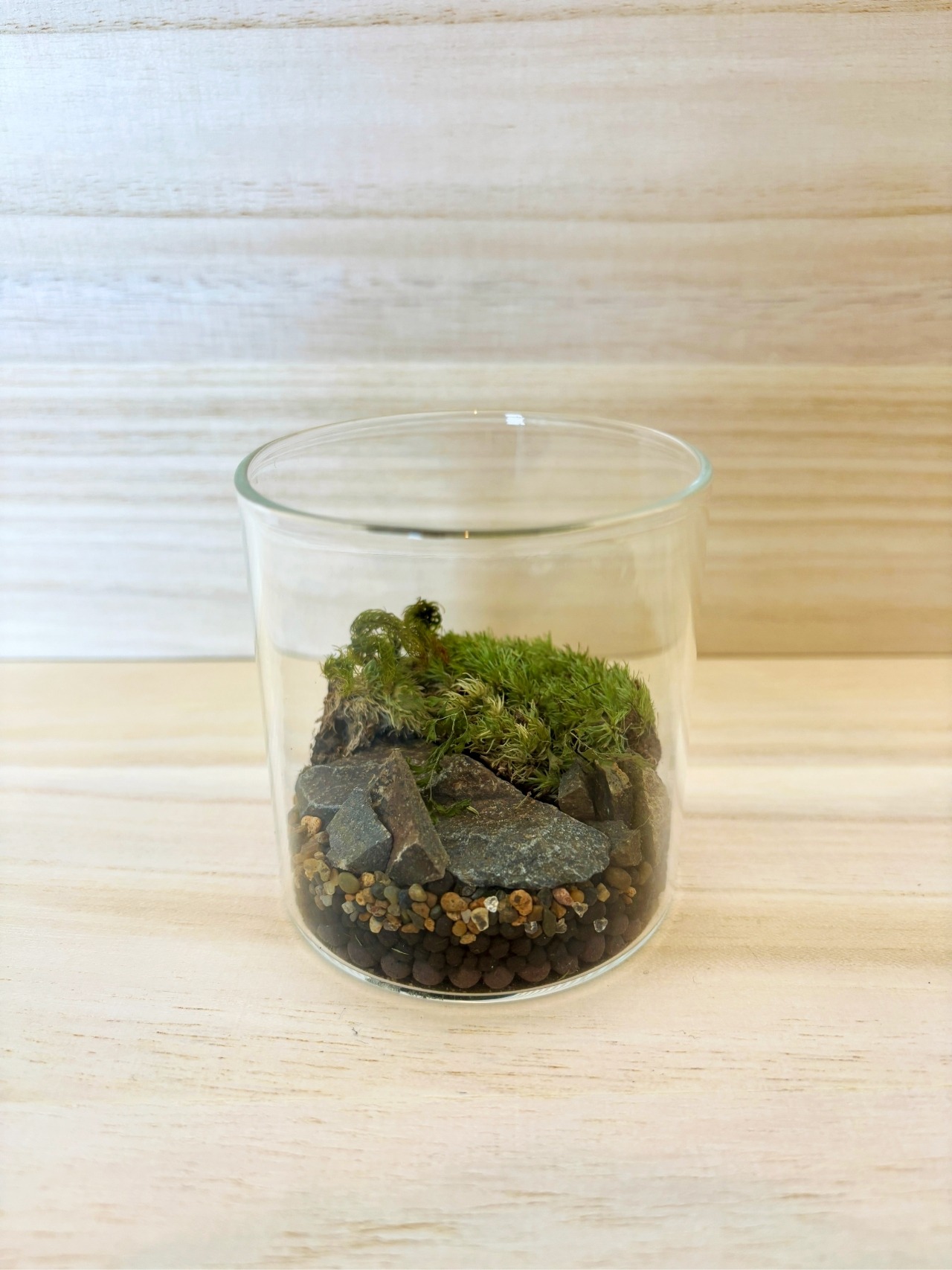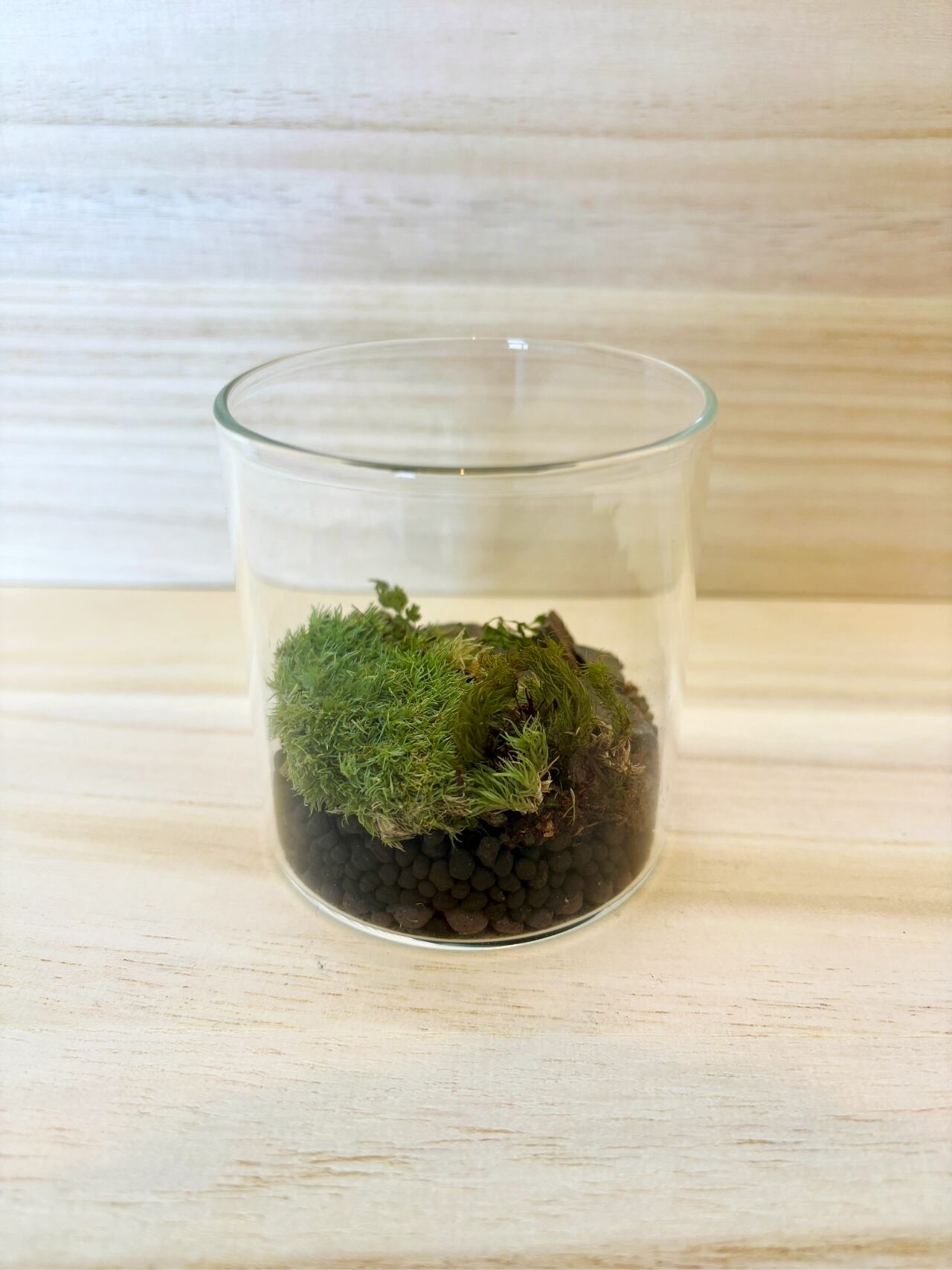 ガラス容器の中に数種類の苔や石を使用し、一点一点手作りで苔の生えている景色を切り取ったような作品に仕上がっています。(アラハシラガゴケ、スギゴケなどを使用)
