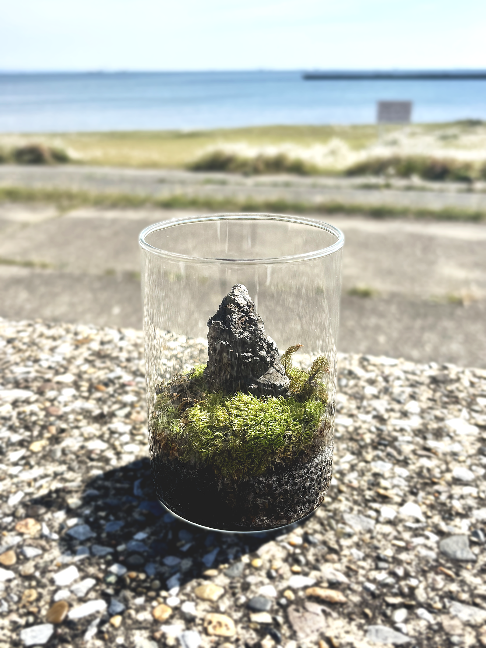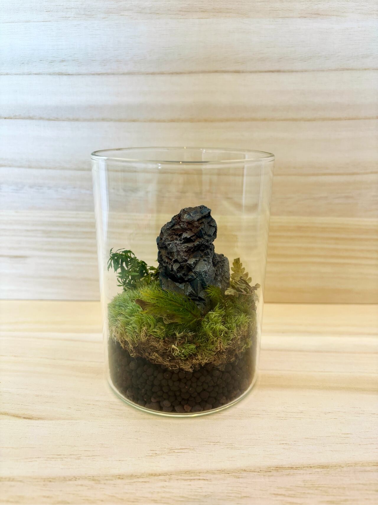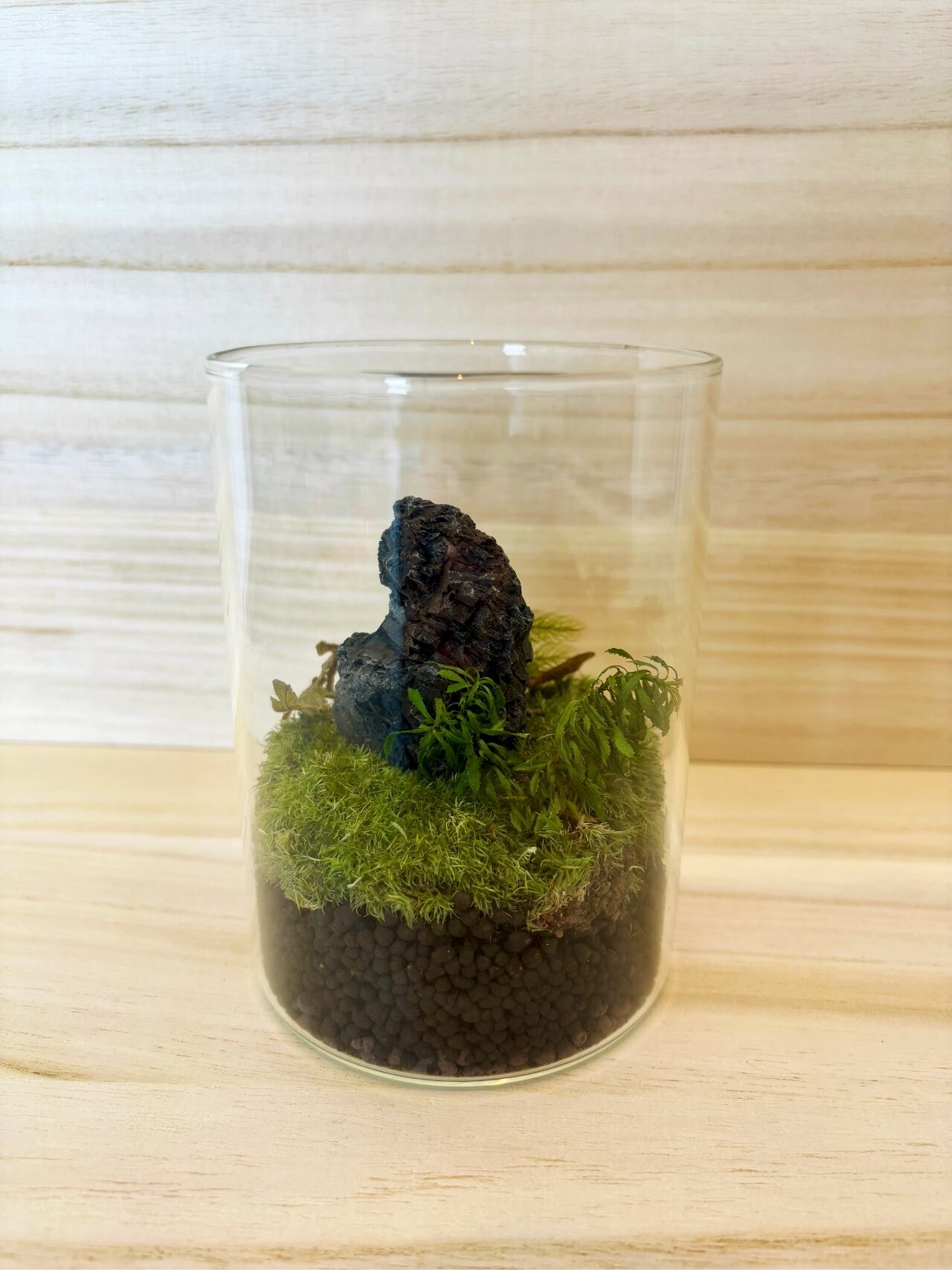 ガラス容器の中に数種類の苔や石を使用し、一点一点手作りで苔の生えている景色を切り取ったような作品に仕上がっています。(アラハシラガゴケ、スギゴケなどを使用)