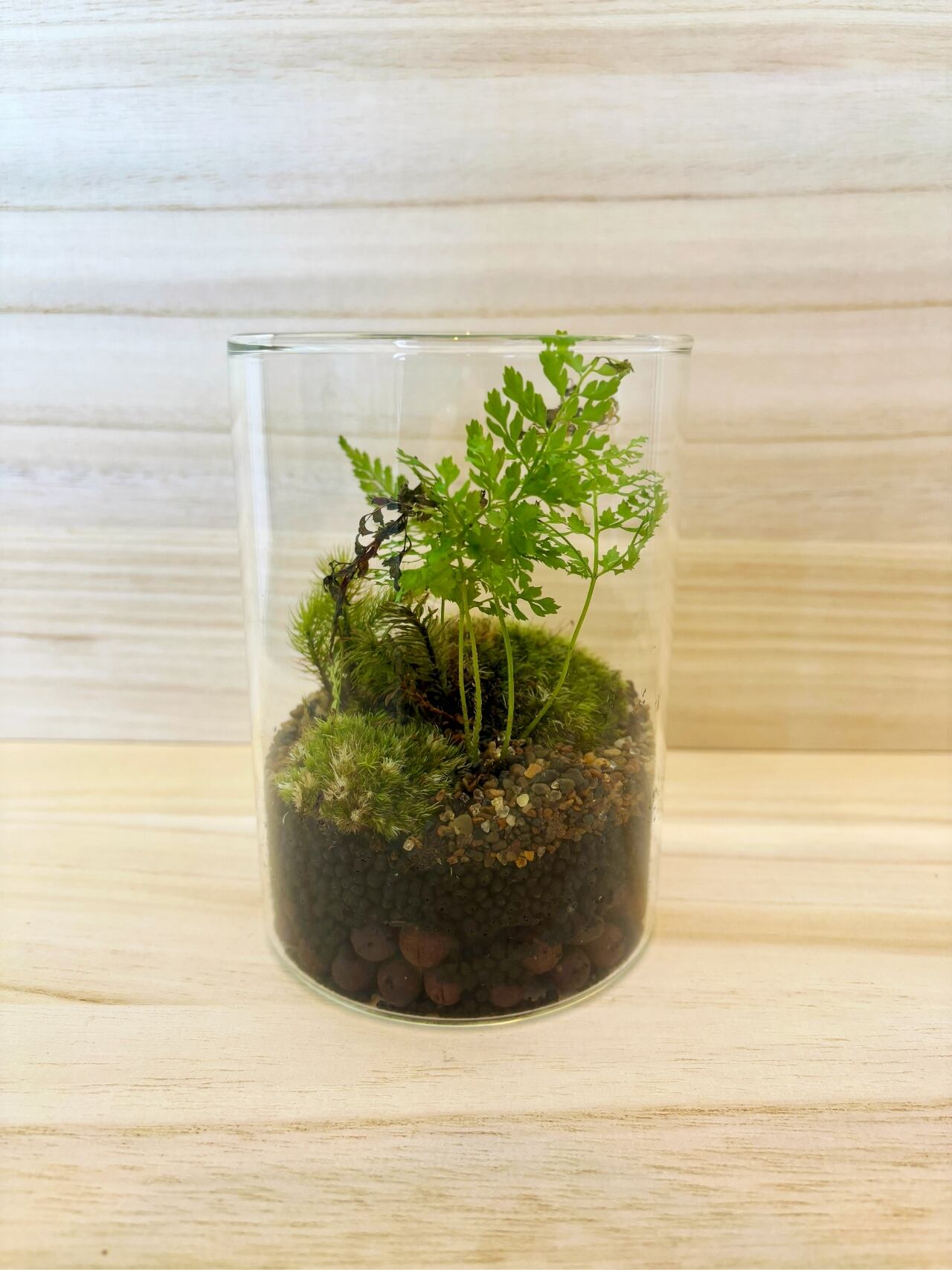 ガラス容器の中に数種類の苔を使用し、一点一点手作りで苔の生えている景色を切り取ったような作品に仕上がっています。(アラハシラガゴケなどを使用)