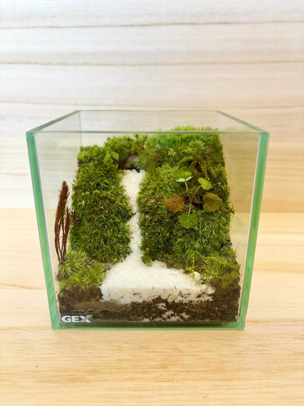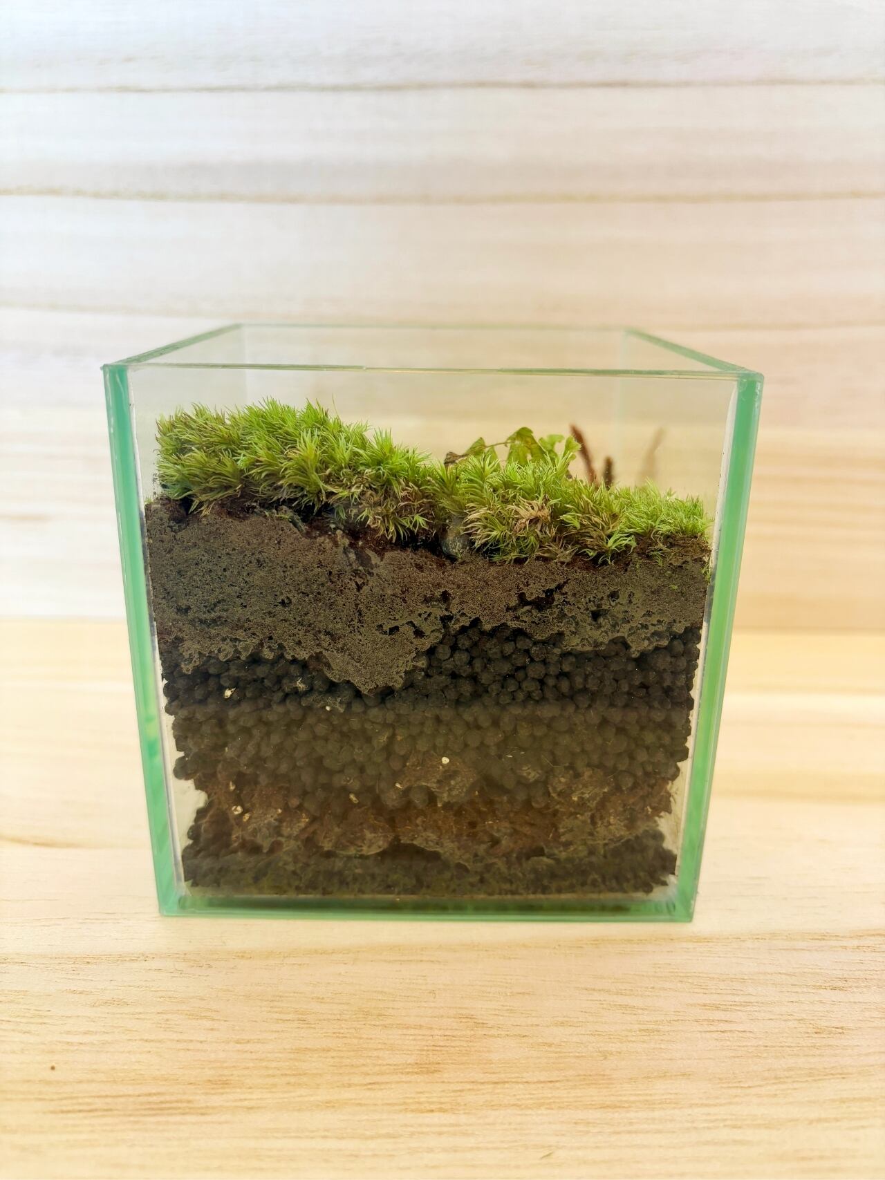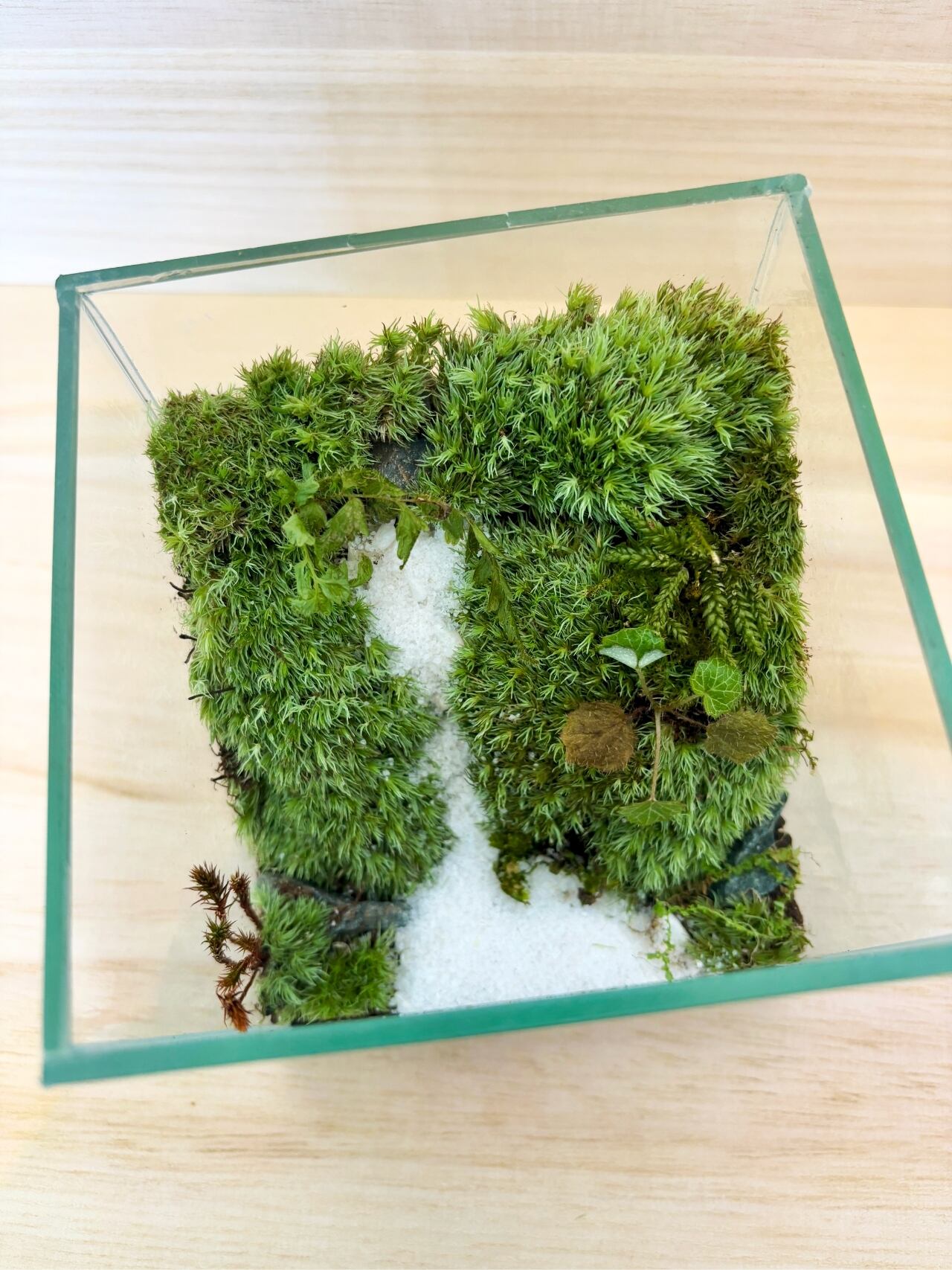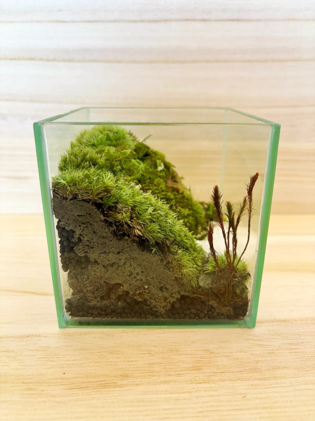 ガラス容器の中に数種類の苔を使用し、一点一点手作りで苔の生えている景色を切り取ったような作品に仕上がっています。(アラハシラガゴケなどを使用)