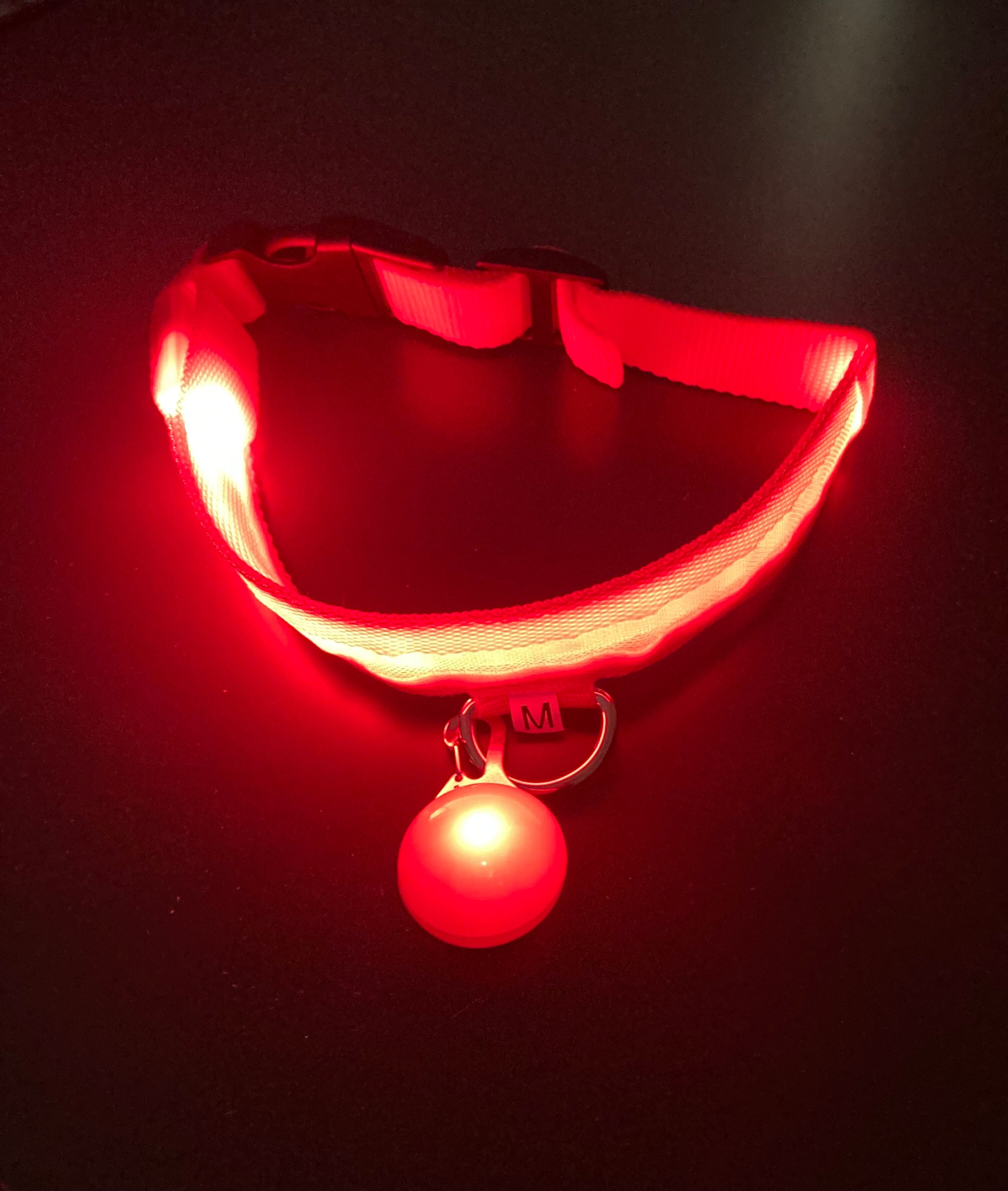 ぴかぴか光る首輪なため、暗闇でも愛犬を見失うことがなく歩行者、自転車、自動車に愛犬がいること